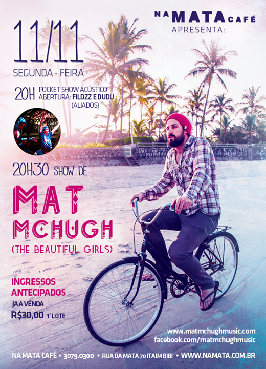 O cantor australiano, que está fazendo uma série de shows com a banda Katchafire, confirmou uma nova apresentação, no bar Na Mata Café, em São Paulo. A abertura fica com o Gustavo Fildzz e Dudu Golzi, da banda Aliados, que farão um pocket show acústico.