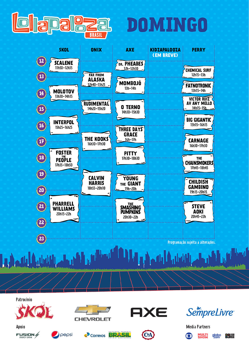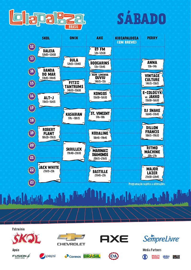 O Lollapalooza Brasil acontece nos dias 28 e 29 de março, no Autódromo de Interlagos, em São Paulo. Veja abaixo a programação completa: