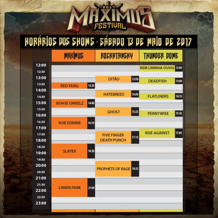O Maximus Festival 2017 acontece no dia 13 de maio, em Interlagos, com três palcos e uma incrível estrutura de entretenimento, gastronomia e diversão. O line up conta com quinze bandas confirmadas: Linkin Park, Slayer, Rob Zombie, Red Fang, Böhse Onkelz, Prophets of Rage, Five Finger Death Punch, Ghost, Hatebreed, Oitão, Rise Against, Pennywise, The Flatliners, Dead Fish e Nem Liminha Ouviu.