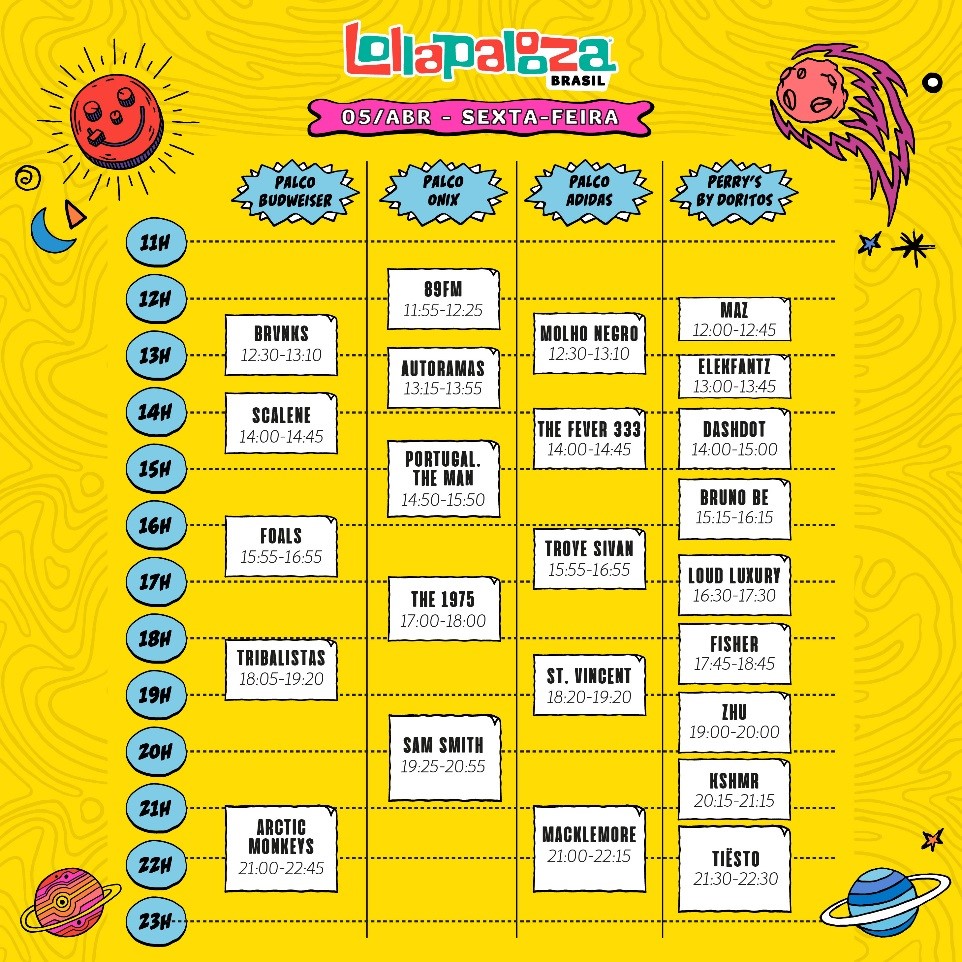 Os artistas estarão divididos em quatro palcos – Palco Budweiser, Onix, Adidas e Perry’s by Doritos. Arctic Monkeys, Macklemore e Tiësto encerram a noite do dia 5 de abril, sexta