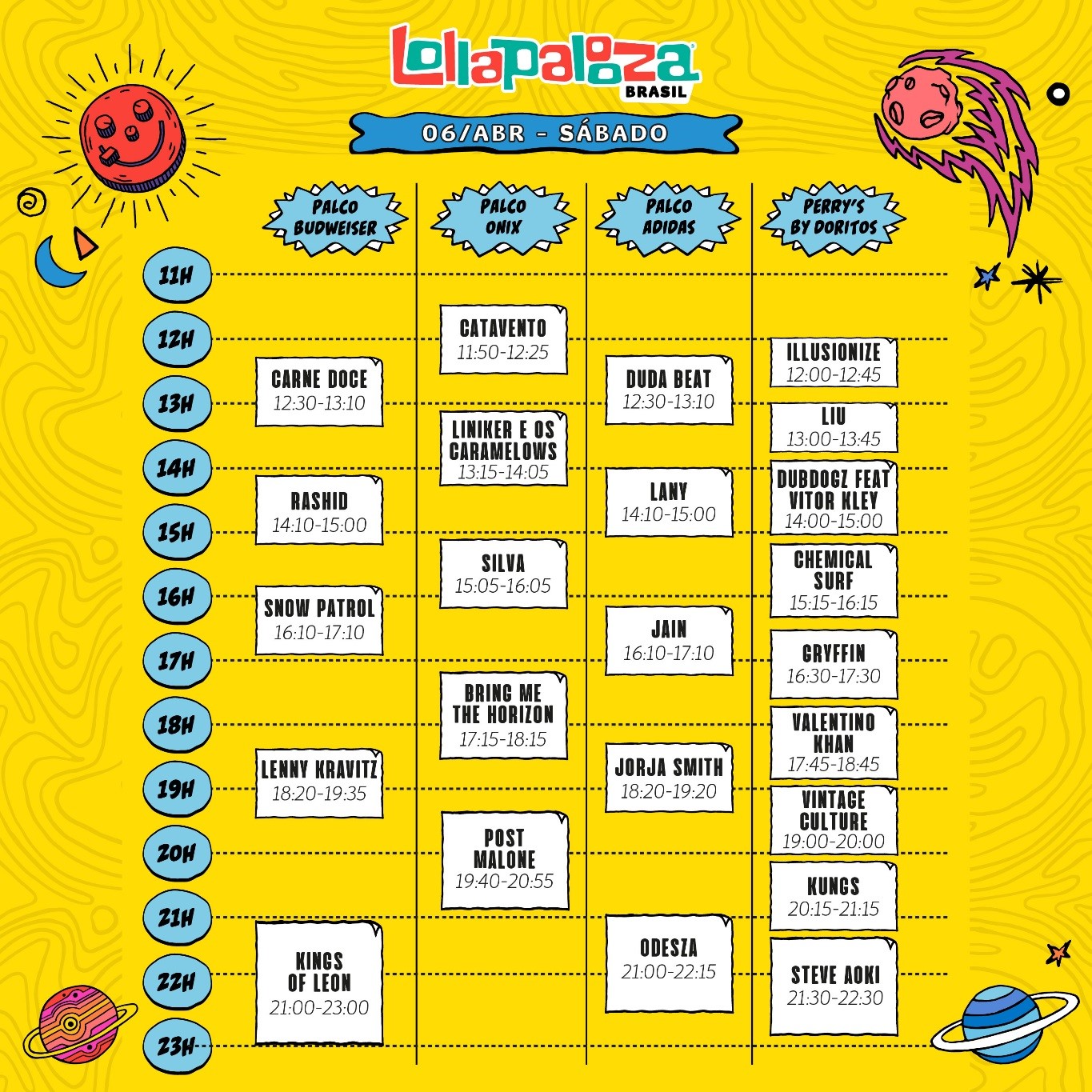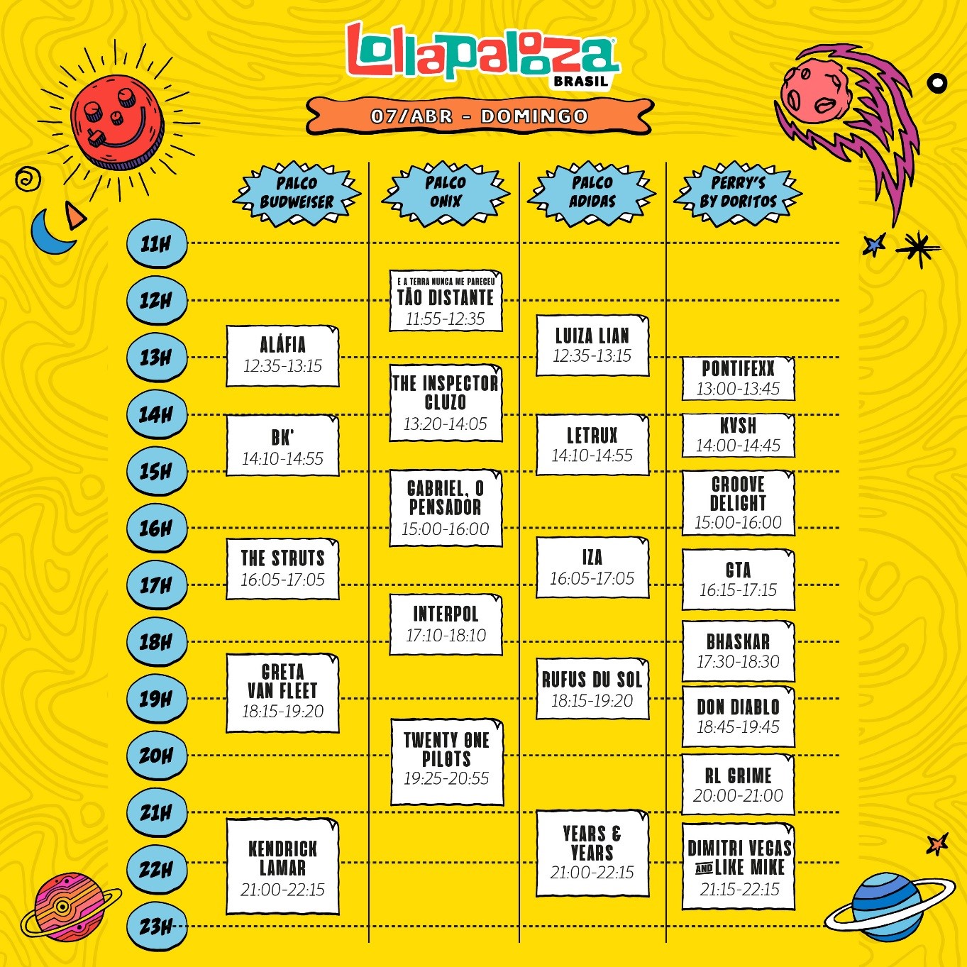 Confira o serviço completo no link. Veja abaixo a ordem das apresentações e horários do Lollapalooza Brasil 2019.