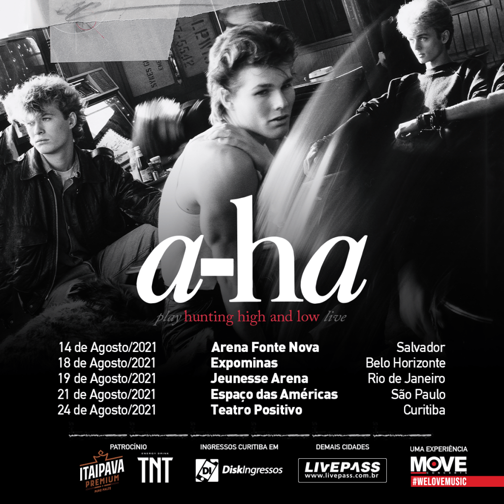 A turnê mundial que celebra o aniversário de 35 anos do álbum de estreia do grupo norueguês A-HA, “Hunting High AndLow”, tem novas datas para chegar ao Brasil. Adiada em decorrência da pandemia de Covid-19, os shows irão acontecer agora em 2021, em14 de agosto, na Arena Fonte Nova, em Salvador, 18 de agosto no Expominas, em Belo Horizonte, 19 de agosto na Jeunesse Arena, Rio de Janeiro, 21 de agosto no Espaço das Américas, em São Paulo e em 24 de agosto no Teatro Positivo, em Curitiba.