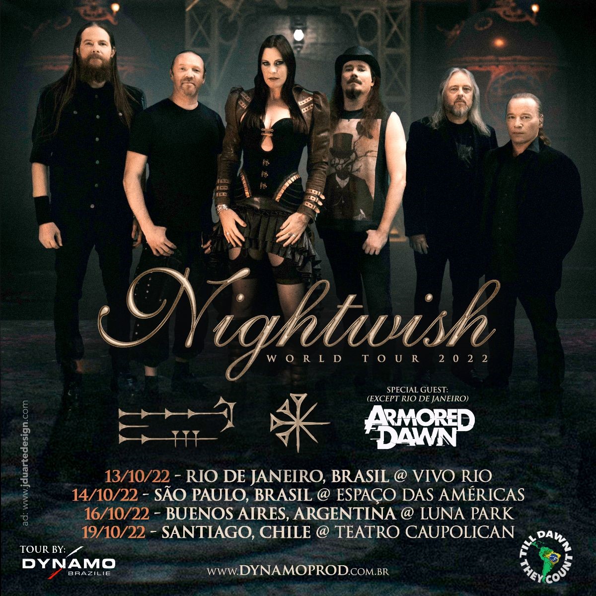 A banda finlandesa Nightwish, verdadeiro fenômeno do heavy metal mundial, comunica oficialmente as novas datas da turnê “HUMAN. :II: NATURE. – World tour” pela América do Sul em 2022. Os shows que aconteceriam em outubro deste ano foram reagendados para outubro de 2022.
