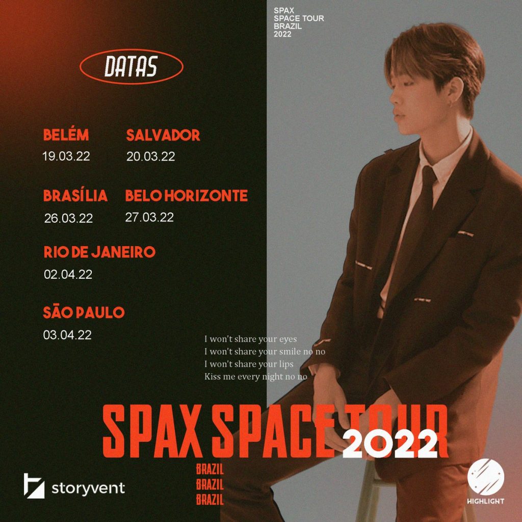 Depois de ter sua turnê interrompida em março de 2020 devido a pandemia, a Highlight Produções anuncia que o astro de k-pop Spax retoma a SPACE TOUR em 2022, seguindo todas as recomendações da OMS (Organização Mundial da Saúde).