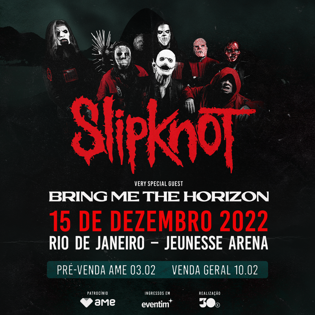 Headliner de seu festival em São Paulo no dia 19 de dezembro de 2022, o SLIPKNOT acaba de confirmar uma apresentação única no Rio de Janeiro, em 15 de dezembro de 2022 na Jeunesse Arena, tendo como convidado especial o Bring Me The Horizon.