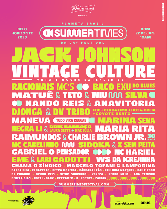 Belo Horizonte recebe a primeira edição do SummerTimes Festival, estrelando o havaiano Jack Johnson, o gigante da música eletrônica brasileira Vintage Culture, além de Racionais MC’s, Marina Sena, Djonga, Silva, Baco Exu do Blues, Matuê, Sidoka e outros grandes nomes. Um formato inédito, com quatro palcos espalhados no gramado e na esplanada, algo nunca visto no Mineirão.