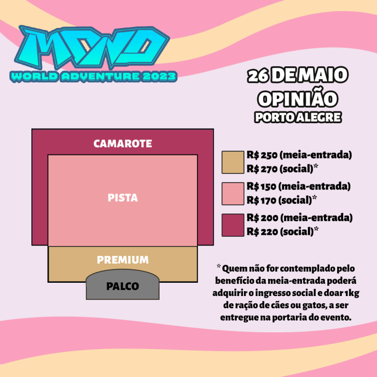 Pista Premium: Inteira solidária R$ 270 | Meia entrada R$ 250 | Inteira: R$ 500
