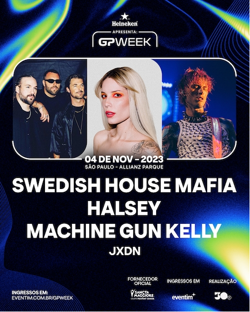 A música é responsável por guiar momentos importantes na vida das pessoas. Uma trilha sonora é capaz de fazer o coração bater mais rápido ou desacelerar, ela é companhia no carro, em situações de descontração e de contemplação. O GPWeek, festival que antecede a etapa do Grande Prêmio Brasil de Fórmula 1, em São Paulo, surgiu exatamente com o objetivo de celebrar a música em uma das semanas mais importantes do calendário esportivo e cultural da cidade de São Paulo. Após uma primeira edição esgotada em 2022, o evento confirma a sua segunda edição para o dia 4 de novembro, no Allianz Parque, na Zona Oeste da capital paulista. Realizado pela 30e, o GPWeek, mais uma vez, entrega uma programação responsável por amplificar a importância da música para toda a sociedade. Em 2023, o evento tem os seguintes nomes confirmados: Swedish House Mafia, Halsey, Machine Gun Kelly e JXDN. O GPWeek 2023 é apresentado pela Heineken e inicia a venda de ingressos no dia 9 de maio, terça-feira, às 10h, na Eventim; e a partir do meio-dia na bilheteria oficial do evento (Allianz Parque, Portão A).