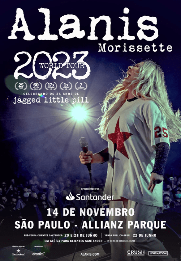 A sete vezes vencedora do Grammy Awards, com mais de 60 milhões de discos vendidos no mundo todo, Alanis Morissette volta ao Brasil após 12 anos! A cantora embarca em turnê no segundo semestre de 2023 para celebrar os 25 anos de seu aclamado e emblemático álbum Jagged Little Pill e o Brasil será o único país da América do Sul a receber esse show histórico. A única apresentação irá acontecer no dia 14 de novembro, no Allianz Parque, em São Paulo, com um repertório que irá passar por todas as músicas do álbum, repleto de hits como “Ironic”, “You Oughta Know”, “Hand in My Pocket” e “You Learn”.