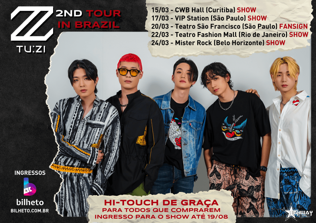 A banda sul-coreana 2Z fará sua segunda turnê no Brasil em 2024. O grupo de pop rock da Coreia do Sul fará shows em São Paulo, Rio de Janeiro, Belo Horizonte e Curitiba em março de 2024. A venda de ingressos começa neste sábado (5) e há opções de ingressos a partir de R$150.