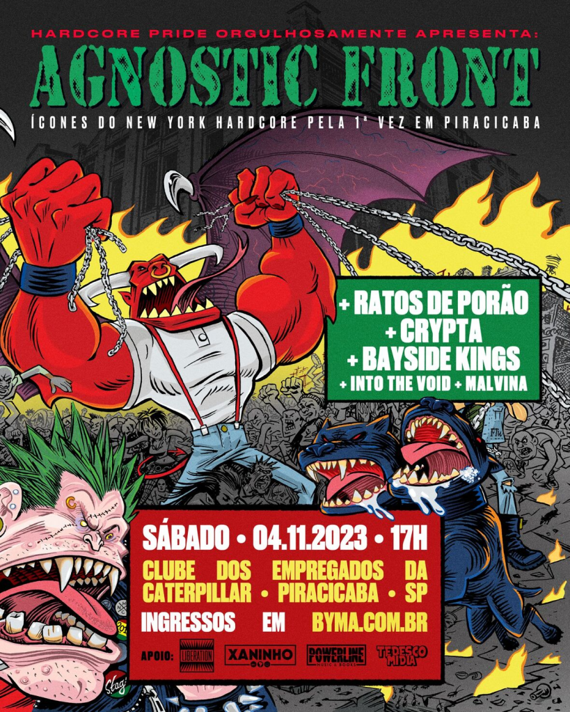 Piracicaba, cidade do interior paulista a 200 quilômetros da capital, será destino inédito para a banda norte-americana Agnostic Front em sua nova turnê pelo Brasil. O show em terras piracicabanas dos precursores do hardcore nova-iorquino, influência máxima para diversas gerações há quatro décadas, acontece dia 4 de novembro, no Clube dos Empregados da Caterpillar.