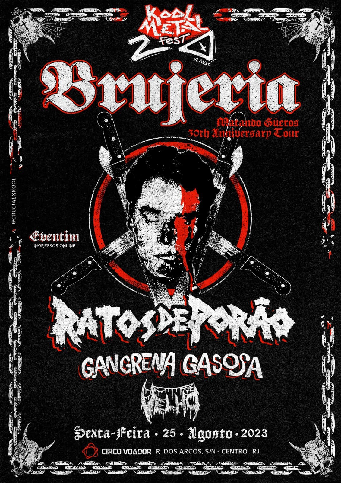 Neste Kool Metal – 20 anos no Rio de Janeiro, a atração principal é o Brujeria com a turnê que exalta os 30 anos do seu disco de estreia, o seminal Matando Güeros.
