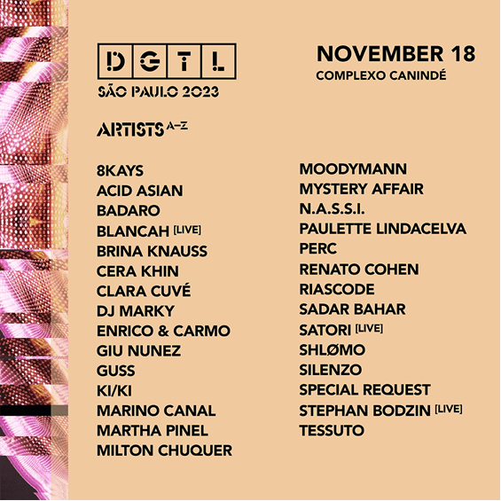 Em meio a tantas novidades, a tradição do DGTL São Paulo de reunir alguns dos maiores nomes da cena eletrônica mundial se mantém! O festival receberá o alemão Stephan Bodzin que já passou por festivais como Tomorrowland, Awakenings, Afterlife e nestes anos se apresentou no Time Warp Brasil; Satori, que aterrissa em São Paulo para uma apresentação Live. Também se apresentam no palco: o brasileiro Acid Asian; Cera Khin, a turca fundadora do instagram “Technomentalhealth”; um dos maiores vanguardistas do Techno, Perc; e o DJ e produtor paulista com mais de 15 anos de carreira, Tessuto.