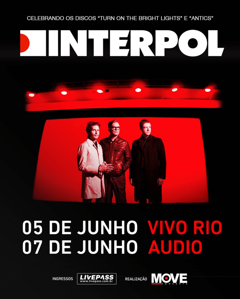 O trio traz uma sonoridade cheia de linhas de baixo e guitarras harmoniosas, no melhor estilo pós-punk, sendo um dos grupos associados à cena musical independente da cidade estadunidense. Entre seus maiores sucessos, podemos destacar as composições “Evil”, “ All The Rage Back Home” e “Obstacle 1”. O grupo tem sete álbuns lançados. Nesta turnê, que passa pelo Brasil em junho de 2024, irão homenagear os dois primeiros trabalhos, “Turn on the Black Lights” (2002) e “Antics” (2004). Com mais de 20 anos de carreira, Interpol promete um show de rock inesquecível e cheio de energia.