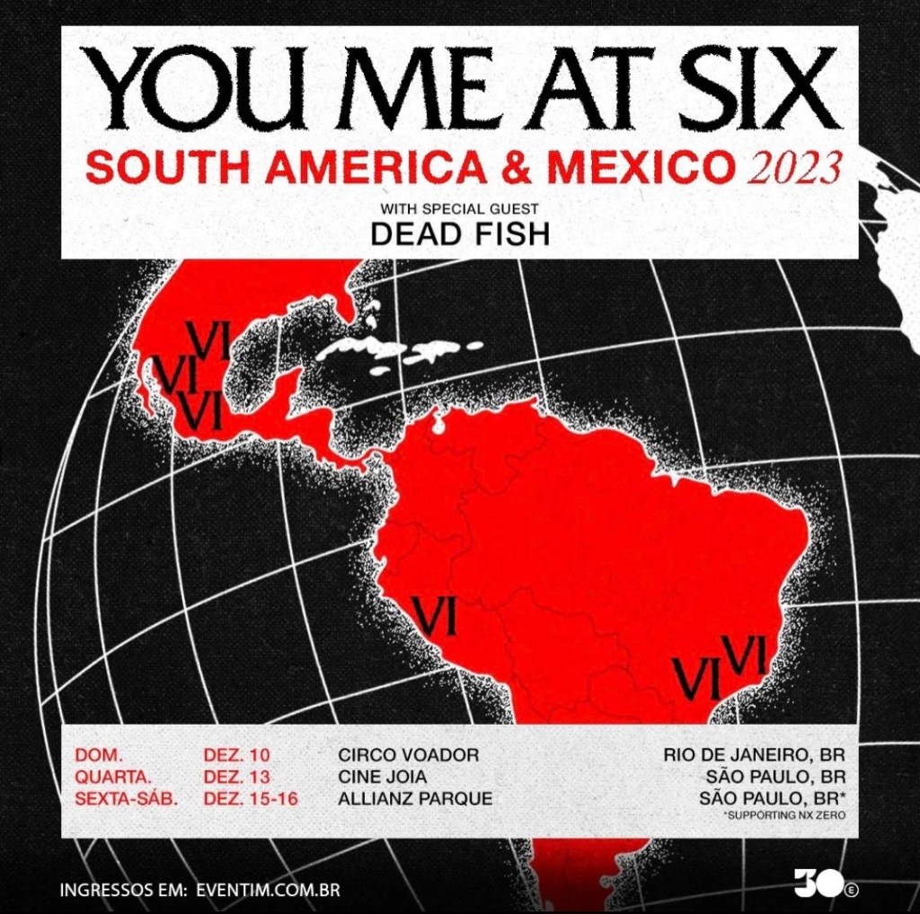 You Me At Six, considerada uma das maiores bandas de rock moderno do momento, vai fazer sua estreia no Brasil com duas apresentações realizadas pela 30e: no dia 10 de dezembro, o quinteto sobe ao palco do Circo Voador, no Rio de Janeiro; e, no dia 13, é a vez de São Paulo receber a banda para um show no Cine Joia. A abertura das duas apresentações fica a cargo da Dead Fish, banda capixaba de hardcore com mais de 30 anos de estrada.