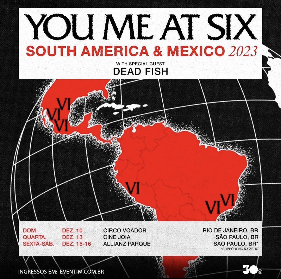 You Me At Six, considerada uma das maiores bandas de rock moderno do momento, vai fazer sua estreia no Brasil com duas apresentações realizadas pela 30e: no dia 10 de dezembro, o quinteto sobe ao palco do Circo Voador, no Rio de Janeiro; e, no dia 13, é a vez de São Paulo receber a banda para um show no Cine Joia. A abertura das duas apresentações fica a cargo da Dead Fish, banda capixaba de hardcore com mais de 30 anos de estrada.