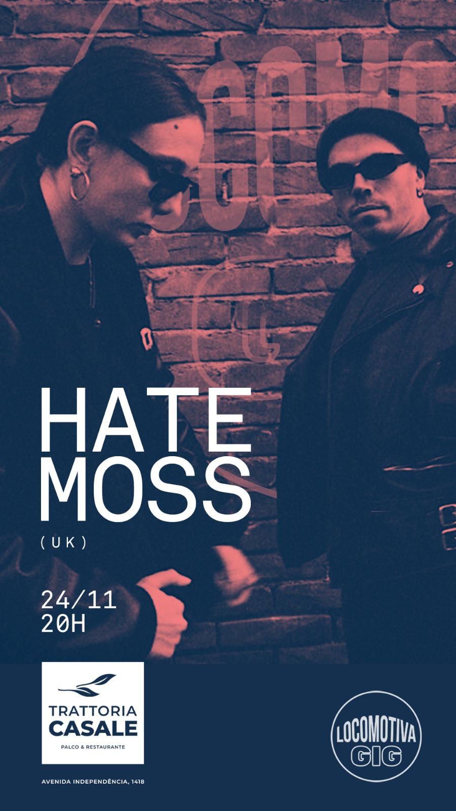 Nesta sexta-feira, 24 de novembro, às 20h, o duo ítalo-brasileiro Hate Moss, que faz um som experimental unindo punk, eletrônico e rock alternativo, retorna a Piracicaba para uma apresentação especial na Trattoria Casale Palco & Restaurante (avenida Independência, 1418). A apresentação é dentro do Locomotiva Gig, um projeto do Locomotiva Festival.