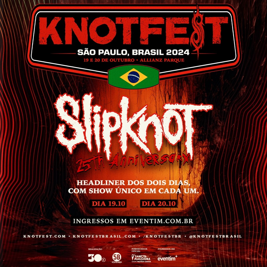 No final do ano passado, o Slipknot, uma das maiores bandas de heavy metal do planeta, anunciou uma turnê especial em comemoração aos 25 anos do lançamento de seu primeiro álbum, Slipknot, de 1999, considerado pelos críticos como fundamental para o Metal Moderno. O Brasil foi incluído na tour e com um diferencial: nos dias 19 e 20 de outubro, será realizada, no Allianz Parque, em São Paulo, a segunda edição brasileira do KNOTFEST – uma produção da 30e e 5B Artist Management. O Slipknot será headliner nos dois dias de festival e trará shows diferentes para cada um dos dias. No primeiro dia, 19 de outubro, a banda apresentará um repertório em comemoração aos seus 25 anos de história. Já na segunda data, 20 de outubro, o grupo tocará o seu disco de estreia na íntegra. A pré-venda de ingressos para a segunda edição do KNOTFEST Brasil tem início no dia 1 de fevereiro e as vendas gerais para o dia 2 de fevereiro, ambas realizadas no site Eventim.
