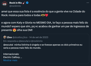 Seguindo a filosofia de sonhar e fazer acontecer, o Rock in Rio expressou sua gratidão a um fã especial que propôs alguns nomes de artistas para o festival seguindo a fundo a essência da curadoria e do que se vive na Cidade do Rock, com música para todos os gostos – já que desde 1985 o festival abraça uma ampla variedade de ritmos e estilos musicais, mostrando, logo em sua primeira edição, que busca a construção de um line-up diversificado. A lista compartilhada no “X” por Zico, em setembro de 2023, trouxe uma surpreendente coincidência com os anúncios de ontem à noite. O jovem citou os nomes de Katy Perry e Gloria Gaynor em suas sugestões, sem saber que suas escolhas e seu sonho se tornariam realidade no festival.