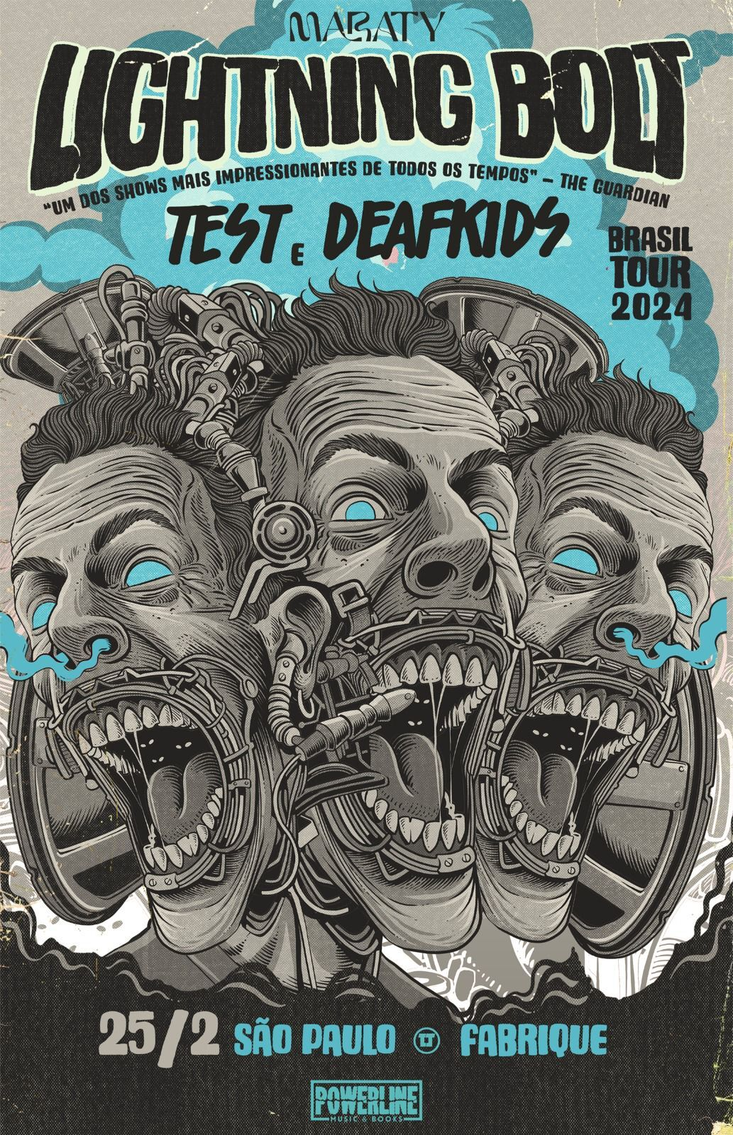 O show do duo norte-americano Lightning Bolt em São Paulo acontece neste domingo (25/02), no Fabrique Club. Duas bandas fazem a abertura como convidadas especiais: Test e Deaf Kids. A realização é da Maraty, com produção da Powerline Music & Books.