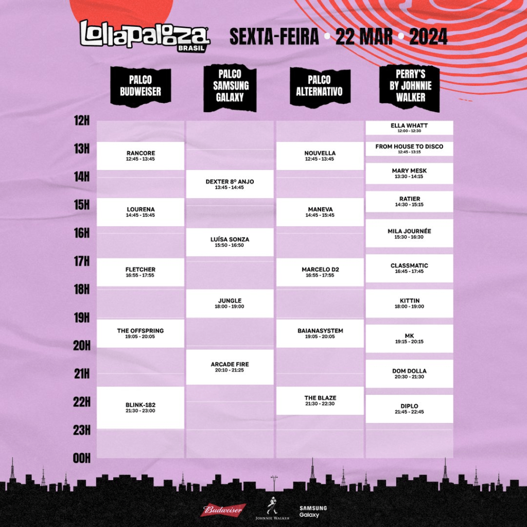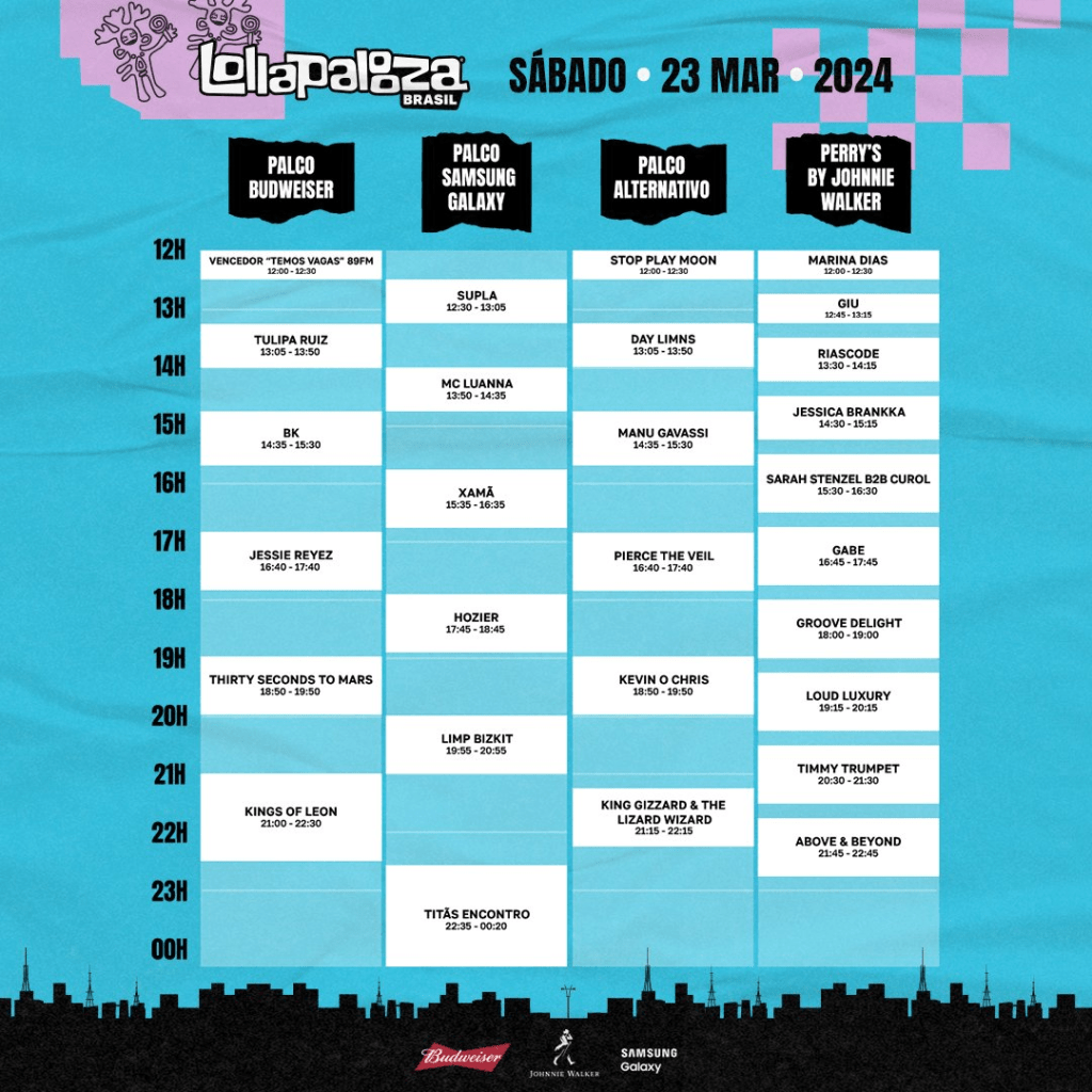 O Lollapalooza Brasil divulgou os tão aguardados horários dos shows. Arcade Fire e Blink-182 serão os headliners do primeiro dia e se apresentam às 20h10 e 21h30 respectivamente, na sexta-feira. No sábado, o show do Limp Bizkit acontece às 19h55, o Kings of Leon se apresenta às 21h e os Titãs fecham o dia com seu show às 22h35. Sam Smith e SZA se apresentam no domingo, às 19h55h e 21h e, fechando a edição de 2024, a banda recém anunciada Greta Van Fleet sobe ao palco às 22h50. A programação completa do festival pode ser consultada no app do festival e em seus canais oficiais. A 11ª edição do festival acontece nos dias 22, 23 e 24 de março de 2024 no Autódromo de Interlagos, em São Paulo.
