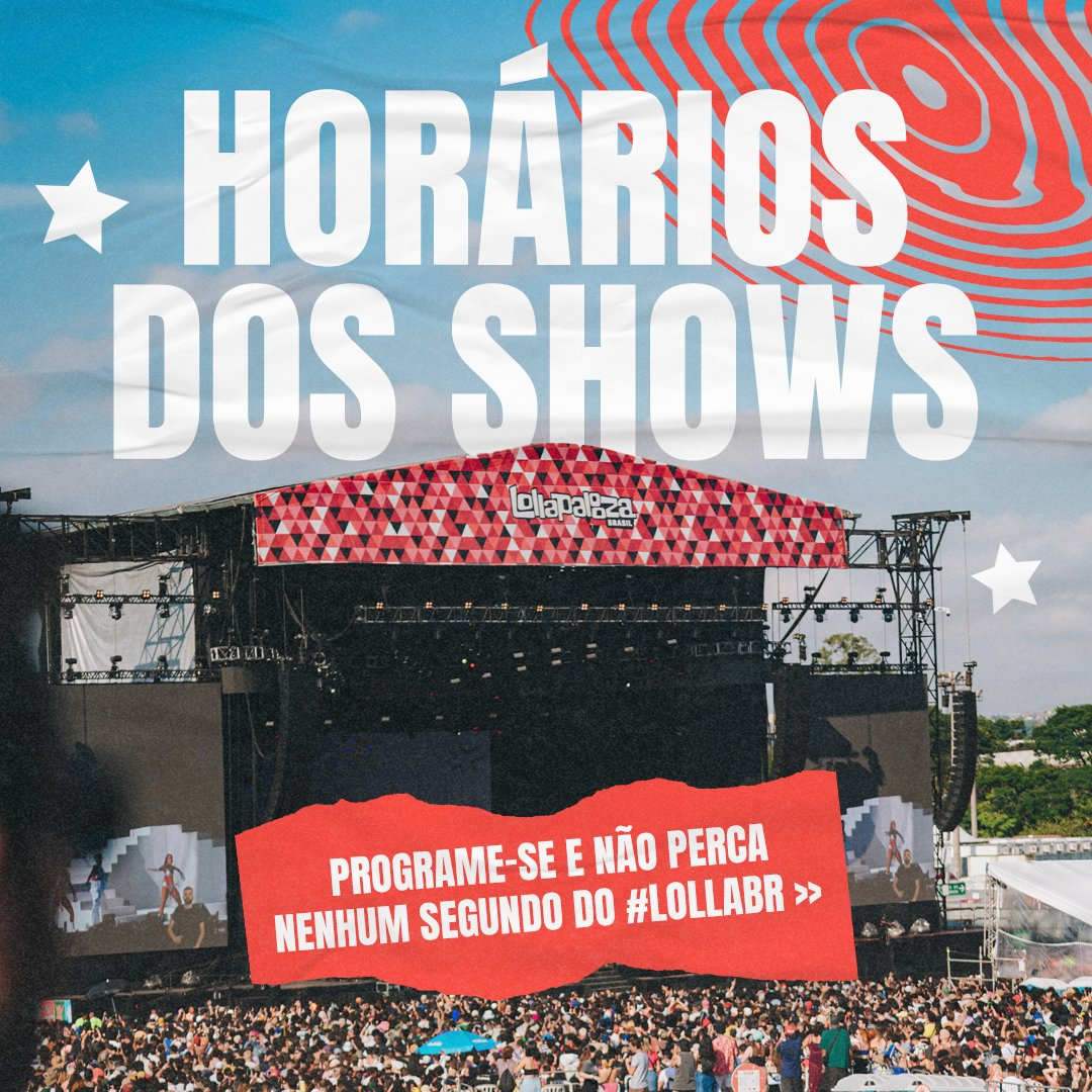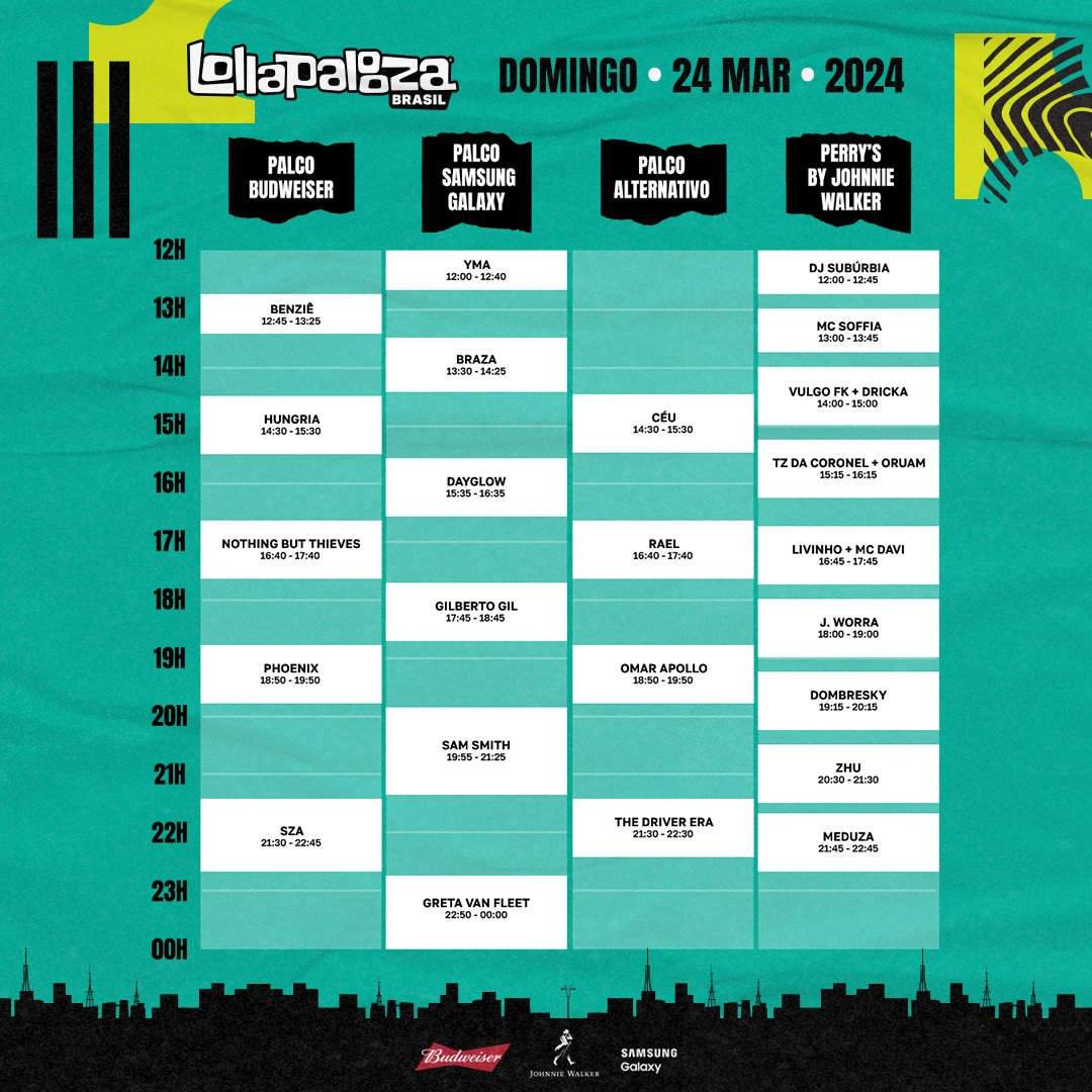 O Lollapalooza Brasil divulgou os tão aguardados horários dos shows. Arcade Fire e Blink-182 serão os headliners do primeiro dia e se apresentam às 20h10 e 21h30 respectivamente, na sexta-feira. No sábado, o show do Limp Bizkit acontece às 19h55, o Kings of Leon se apresenta às 21h e os Titãs fecham o dia com seu show às 22h35. Sam Smith e SZA se apresentam no domingo, às 19h55h e 21h e, fechando a edição de 2024, a banda recém anunciada Greta Van Fleet sobe ao palco às 22h50. A programação completa do festival pode ser consultada no app do festival e em seus canais oficiais. A 11ª edição do festival acontece nos dias 22, 23 e 24 de março de 2024 no Autódromo de Interlagos, em São Paulo.