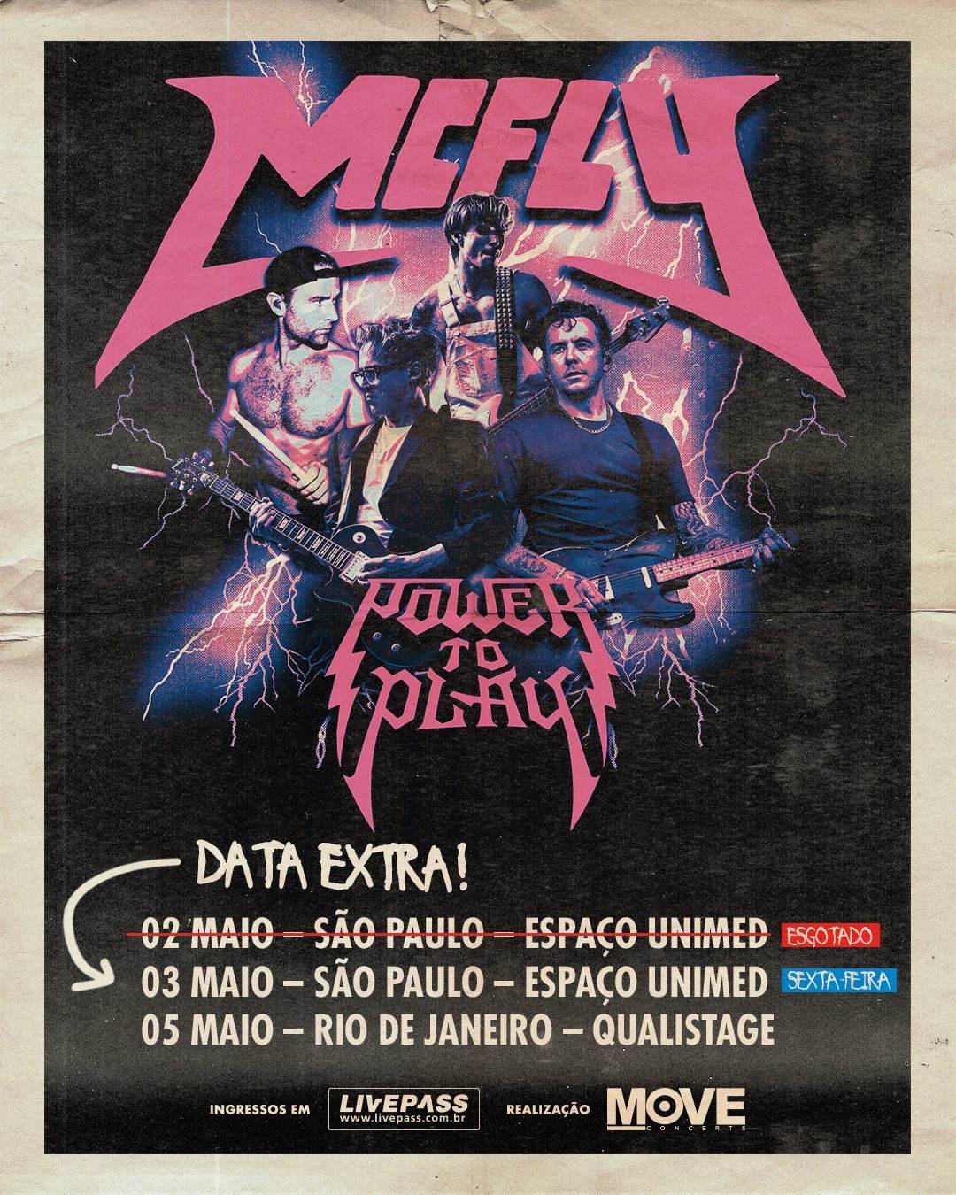 O McFly não se cansa de dizer que adora o Brasil. E o amor, sem sombra de dúvidas, é recíproco. Com todos os ingressos esgotados para a apresentação da nova turnê da banda em São Paulo, no dia 02 de maio, no Espaço Unimed, a passagem do grupo pelo país acaba de ganhar uma data extra. Eles voltam a se apresentar no dia 03 de maio, em mais um show para celebrar os 20 anos de carreira da banda.