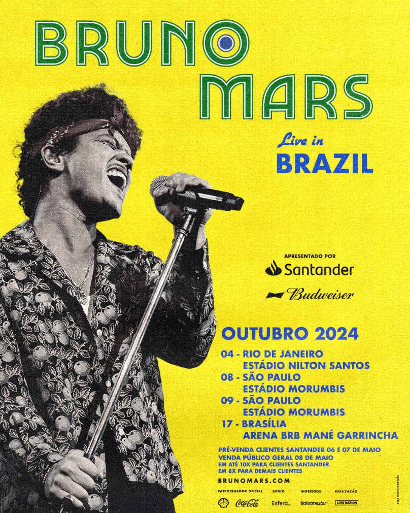BRUNO MARS, a inesgotável máquina global de hits, retornará ao Brasil para quatro shows no país. O multitalentoso showman, vencedor de quatorze GRAMMYs, apresenta-se no dia 04 de outubro no Rio de Janeiro, no Estádio Nilton Santos, dias 08 e 09 de outubro em São Paulo, no Estádio MorumBIS, e no dia 17 de outubro em Brasília, na Arena BRB Mané Garrincha. A tão aguardada volta de Bruno Mars ao país deixará os fãs ainda mais em êxtase. Esta será a quarta vez do artista no Brasil após uma passagem icônica em 2023, onde se apresentou duas noites em São Paulo, para um público eufórico de 100 mil pessoas por dia.