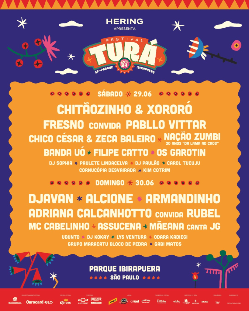 A diversidade do TURÁ São Paulo 2024 não se limita apenas à gastronomia. A programação musical do festival conta com uma seleção de artistas que representam a riqueza cultural do Brasil. No dia 29 de junho, sábado, o público poderá conferir atrações como Chitãozinho & Xororó, Fresno convida Pabllo Vittar, Chico César e Zeca Baleiro, Nação Zumbi, Banda UÓ, Filipe Catto, Os Garotin, entre outros. Já no domingo, dia 30, se apresentam nomes como Djavan, Alcione, Armandinho, Adriana Calcanhotto convida Rubel, MC Cabelinho, Assucena e Mãeana, totalizando mais de 20 shows.