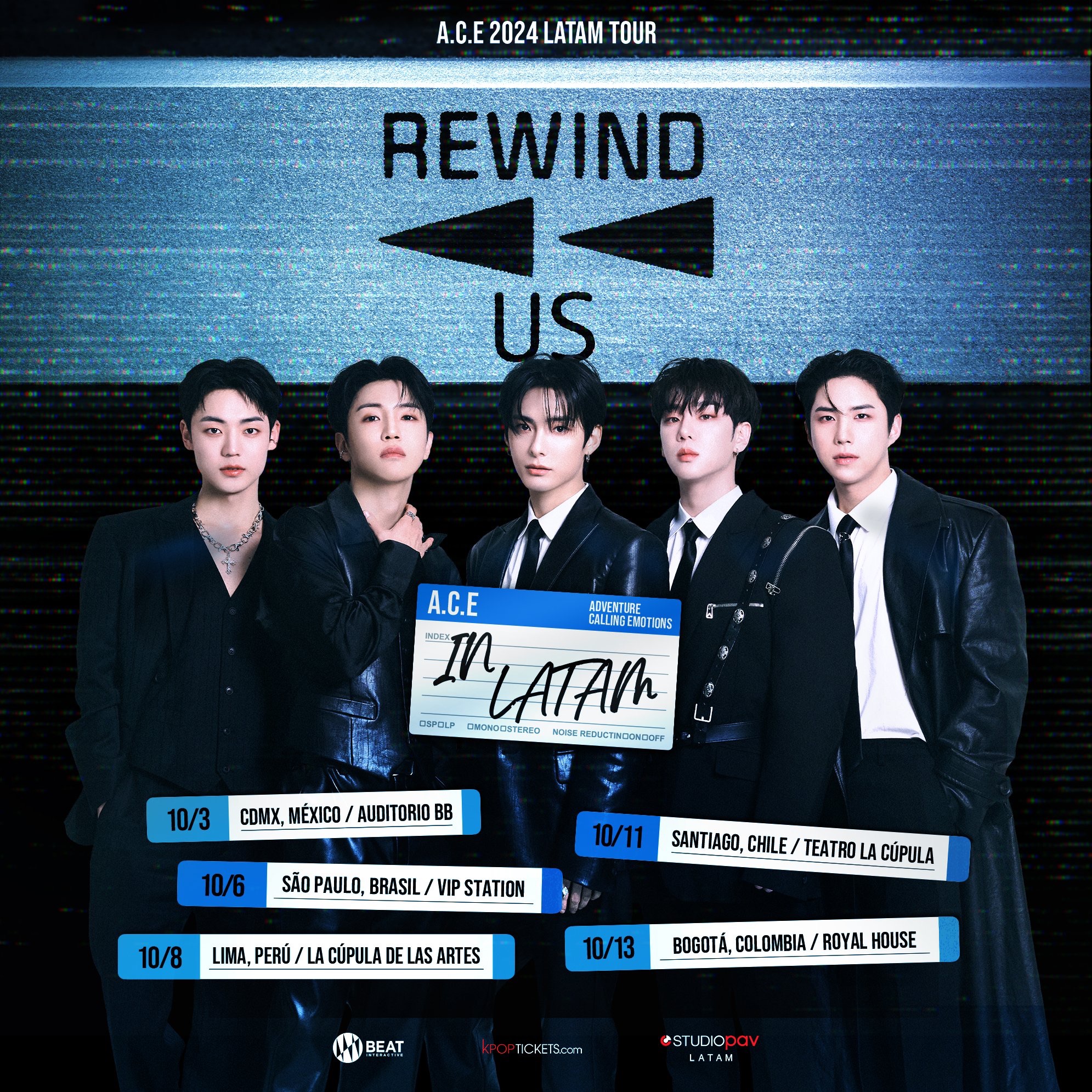 A tão aguardada turnê latino-americana do A.C.E, ⏪ REWIND US TOUR ⏪, está prestes a começar! O grupo chegará à América Latina em outubro, prometendo uma experiência inesquecível para todos os seus fãs dedicados.
