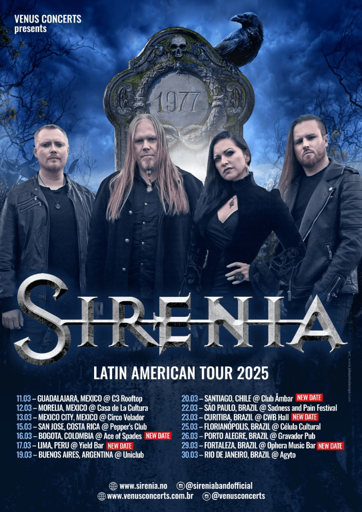 Os noruegueses do Sirenia, banda de metal sinfônico criada no início dos anos 2000 pelo guitarrista Morten Veland após sua saída do Tristania, hoje com a francesa Emmanuelle Zoldan nos vocais, promove nos próximos dias uma turnê brasileira com 5 datas, de 22 a 30 de março. A realização é da Vênus Concerts.