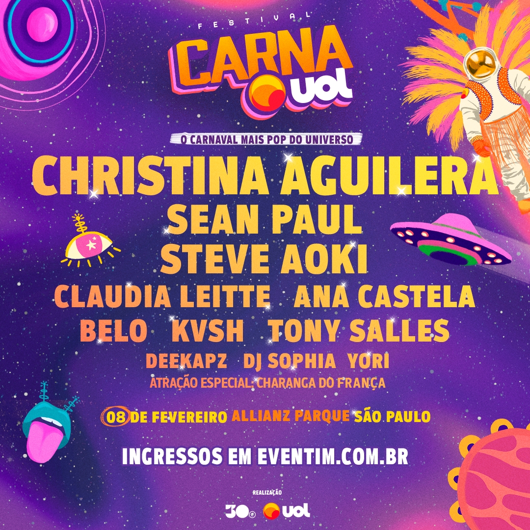 A 10ª edição do CarnaUOL se transformará no Carnaval mais pop do universo e vai contar – pela primeira vez – com artistas internacionais no seu line-up, são eles: Christina Aguilera, Sean Paul e Steve Aoki. Também estão na programação nomes nacionais, como Claudia Leitte, Belo, Ana Castela, Tony Salles, KVSH, DJ Sofia, Deekapz e Yori, dupla vencedora do Toca Revela, o Reality.