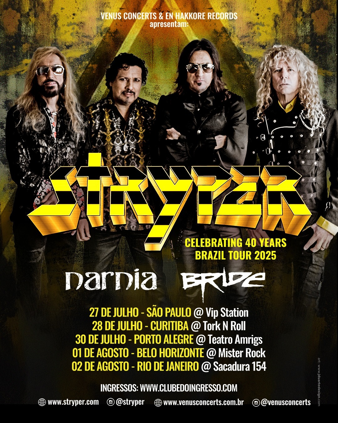 Stryper, ícone mundial do hard rock, volta à América Latina em 2025 em extensa turnê para celebrar 40 anos de uma louvável trajetória na música. Conhecidos por sua sonoridade potente, letras inspiradoras e espiritualizadas, além das apresentações eletrizantes, a banda da Califórnia (EUA) fará cinco shows no Brasil entre julho e agosto, sempre acompanhados de mais duas bandas importantes do rock/metal cristão: Narnia (Suécia) e Bride (EUA). A realização é da Vênus Concerts com a En Hakkore Records.