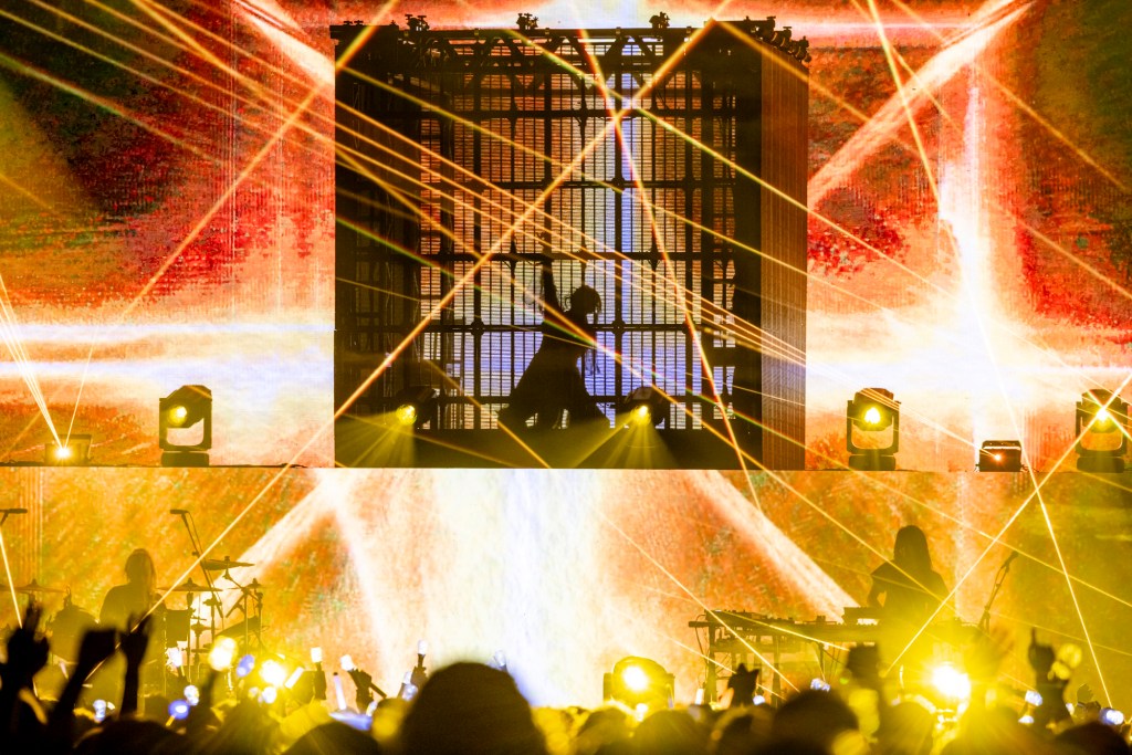 O espetáculo também foi um deleite visual. Um telão imenso projetava imagens que se misturavam às músicas, enquanto feixes de laser cortavam o espaço e a fumaça criava uma atmosfera quase onírica. As luzes dançavam em sincronia com cada batida, transformando o palco em um universo próprio onde mistério e emoção caminhavam lado a lado.