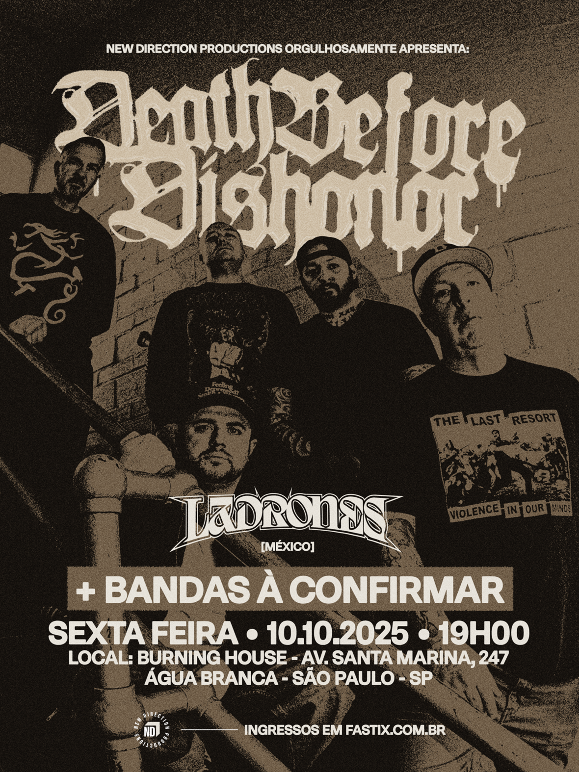 As bandas Death Before Dishonor (Boston, EUA) e Ladrones (México) se apresentam em São Paulo/SP no dia 10 de outubro, no Burning House, em show que reúne dois nomes representativos da cena hardcore e do rap internacional. A produção é da New Direction Productions.