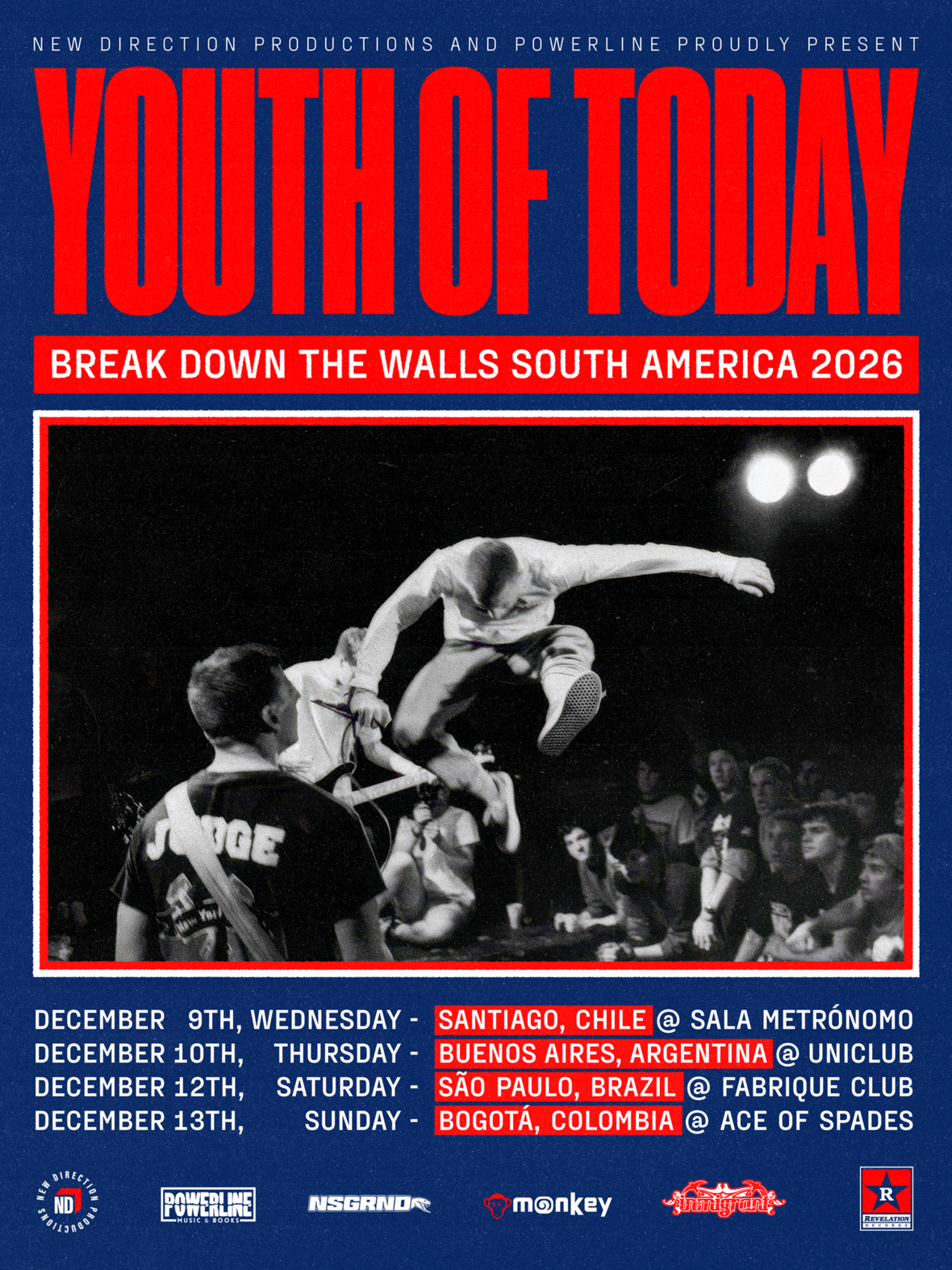 A New Direction Productions e a Powerline Music & Books apresentam em São Paulo, no dia 12 de dezembro de 2026, no Fabrique Club, a banda norte-americana Youth of Today, uma das formações mais importantes da história do hardcore straight edge. O show integra a turnê “Break Down The Walls South America 2026”, que passa também por Santiago (Chile), Buenos Aires (Argentina) e Bogotá (Colômbia).